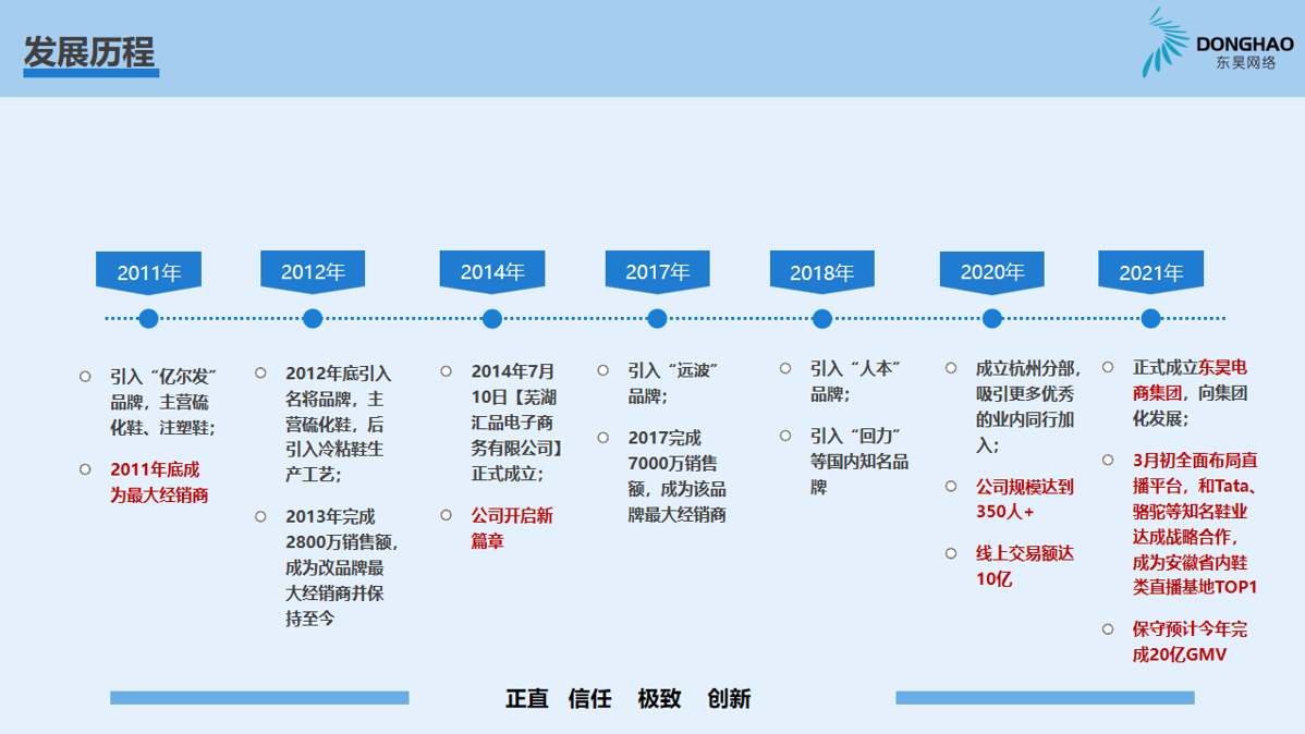 蕪湖東昊網(wǎng)絡(luò)科技有限公司,成立于 2014 年,是一家以互聯(lián)網(wǎng)平臺(tái)銷(xiāo)售為核心的電子商務(wù)運(yùn)營(yíng)商,公司成立以來(lái),始終專(zhuān)注于休閑運(yùn)動(dòng)鞋的互聯(lián)網(wǎng)銷(xiāo)售業(yè)務(wù),產(chǎn)品線(xiàn)覆蓋硫化鞋、注塑鞋、冷粘鞋,在互聯(lián)網(wǎng)二級(jí)類(lèi)目單品牌排名前三,綜合成績(jī)排名TOP1;